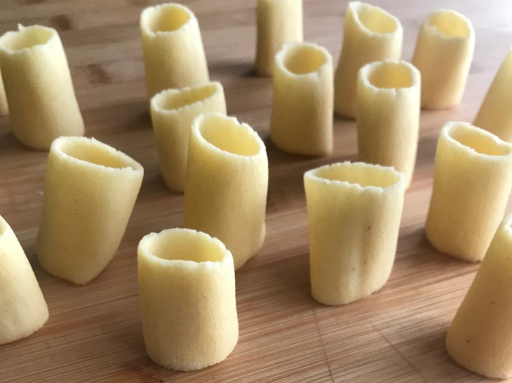 Propongo una lavorazione derivante da quella fatta rigororosamente a mano con il “ferretto”, ovvero uno strumento di metallo utilizzato per la formazione del pacchero.