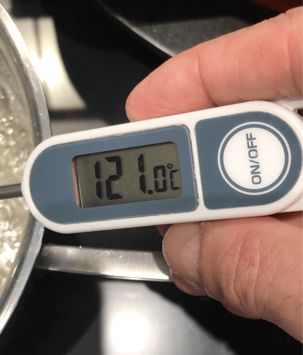 Con l’aiuto di un termometro controllare la temperatura che salirà lentamente. Fermarsi a 121°C. Questa è la temperatura corretta per la preparazione della meringa e che garantisce la pastorizzazione dell’albume. Questo procedimento è molto importante perché la meringa italiana in molte preparazioni non viene cotta.