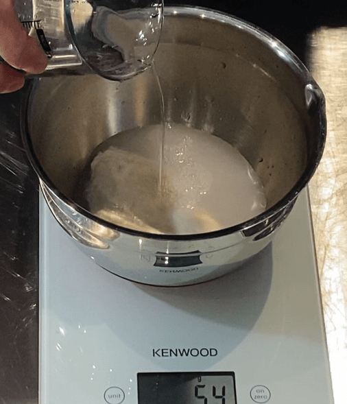 Basta pesare il lievito da rinfrescare e scioglierlo in una quantità di acqua pari al peso del lievito.