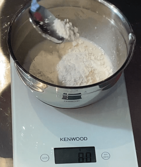 Si aggiunge poi lo stesso peso di farina (nell’esempio 84 grammi), si mescola e il rinfresco è fatto.