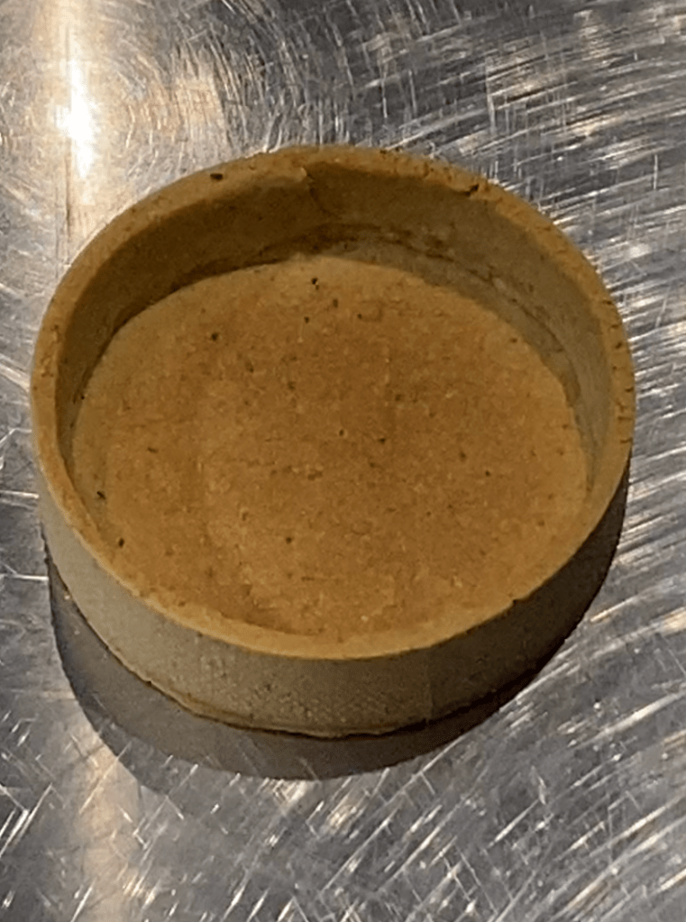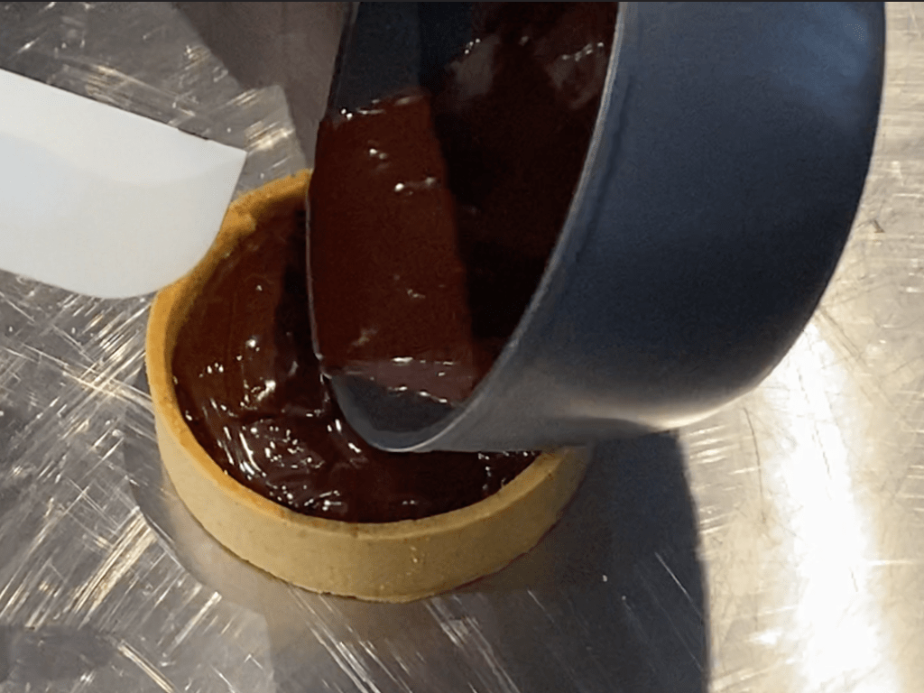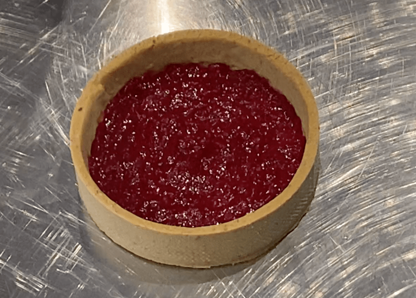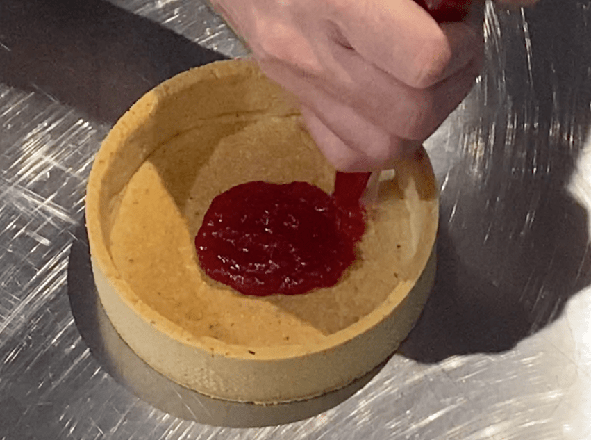 Una volta raffreddata, trasferire la confettura nella sac-à-poche e formare uno strato di pochi millimetri nella forma di pasta frolla per creare la base.