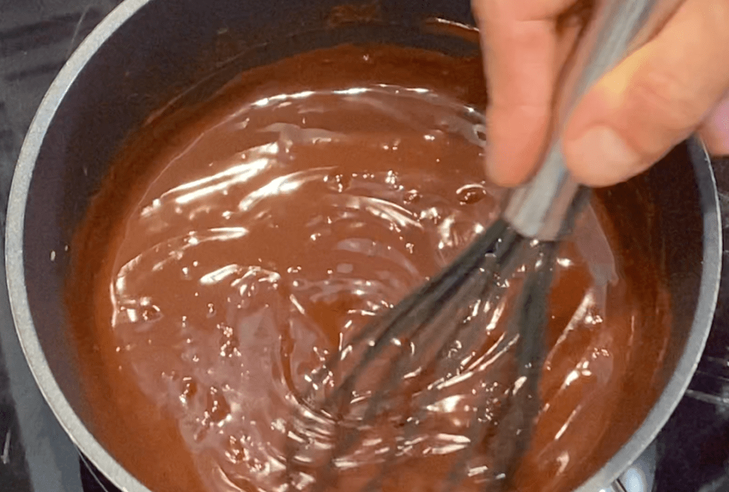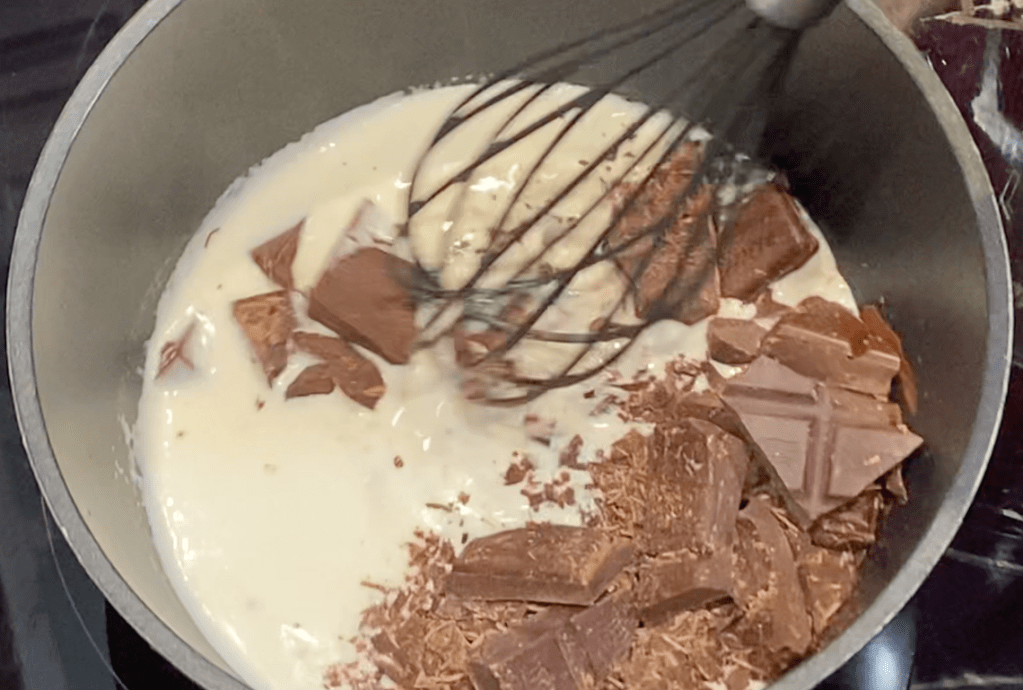 Aggiungere il cioccolato fondente spezzettato e girare continuamente con una frusta fino a che si amalgama bene ottenendo la ganache omogenea e lucida.