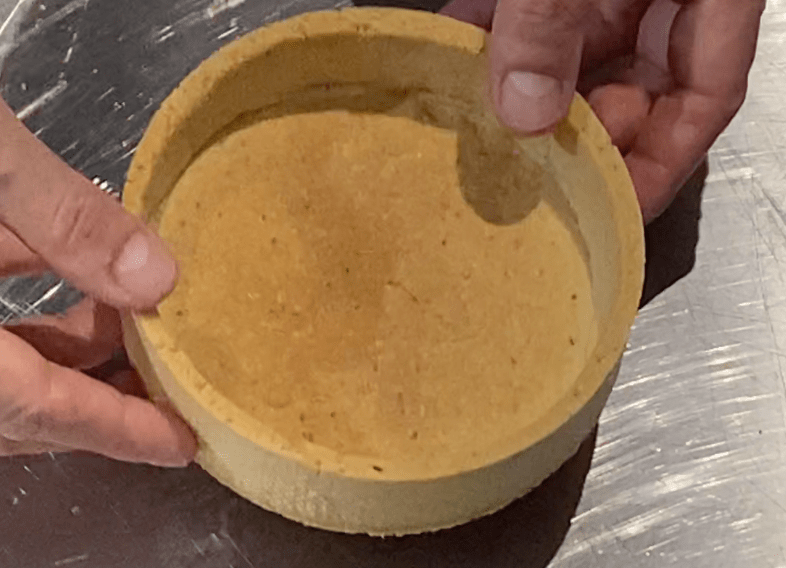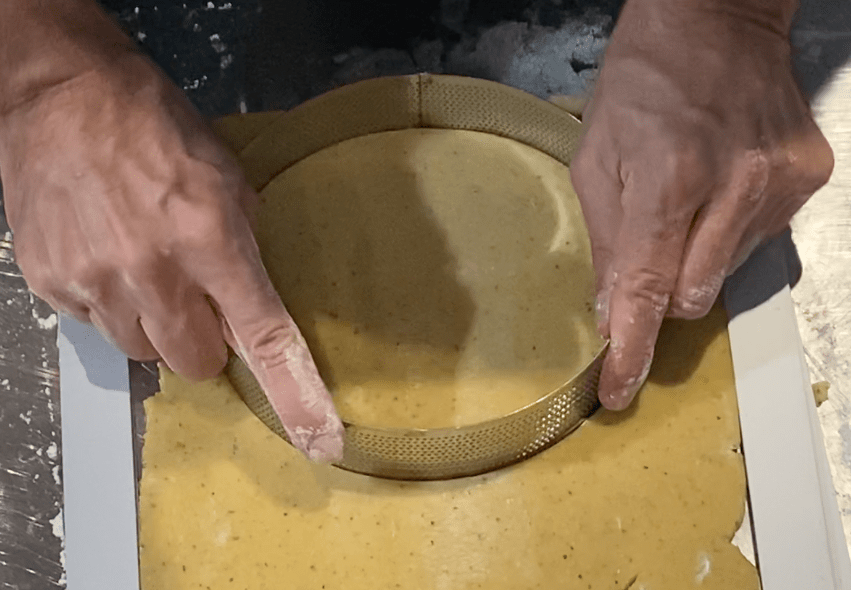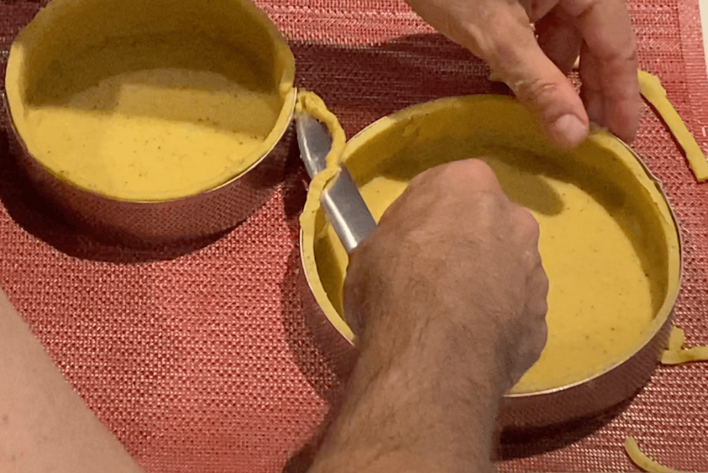 Montiamo poi nei cerchi forati le parti di frolla e andiamo a rimuovere, rifilando con un coltello affilato, l’eccesso di pasta per ottenere un bordo regolare.
