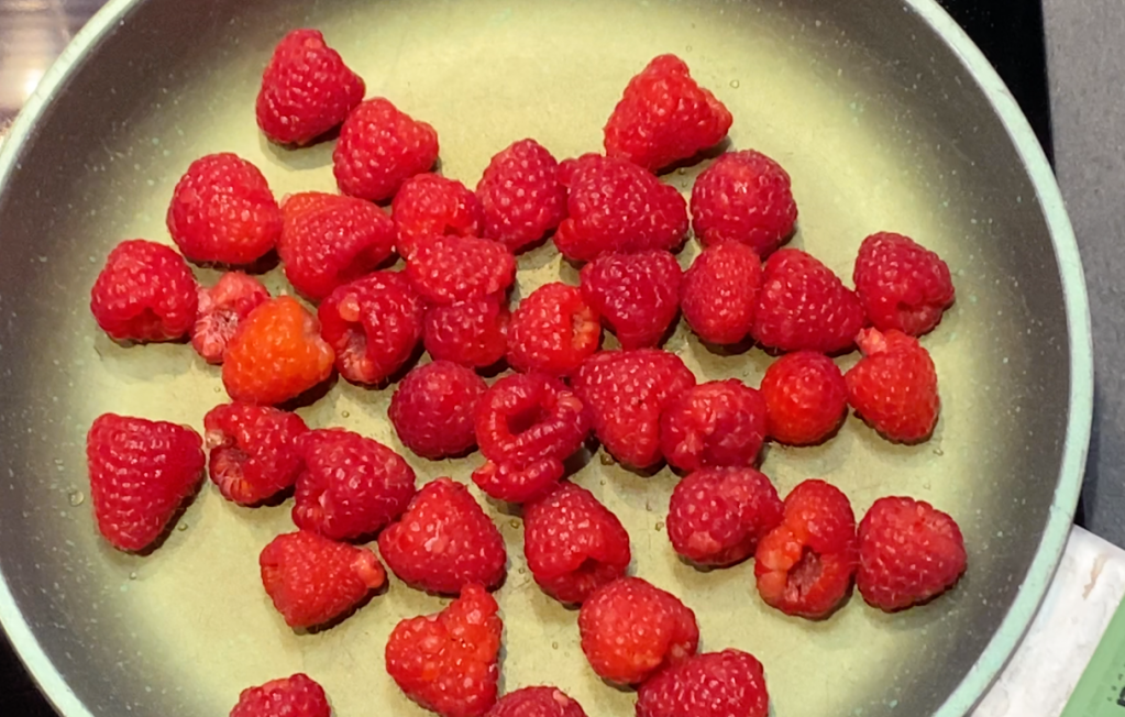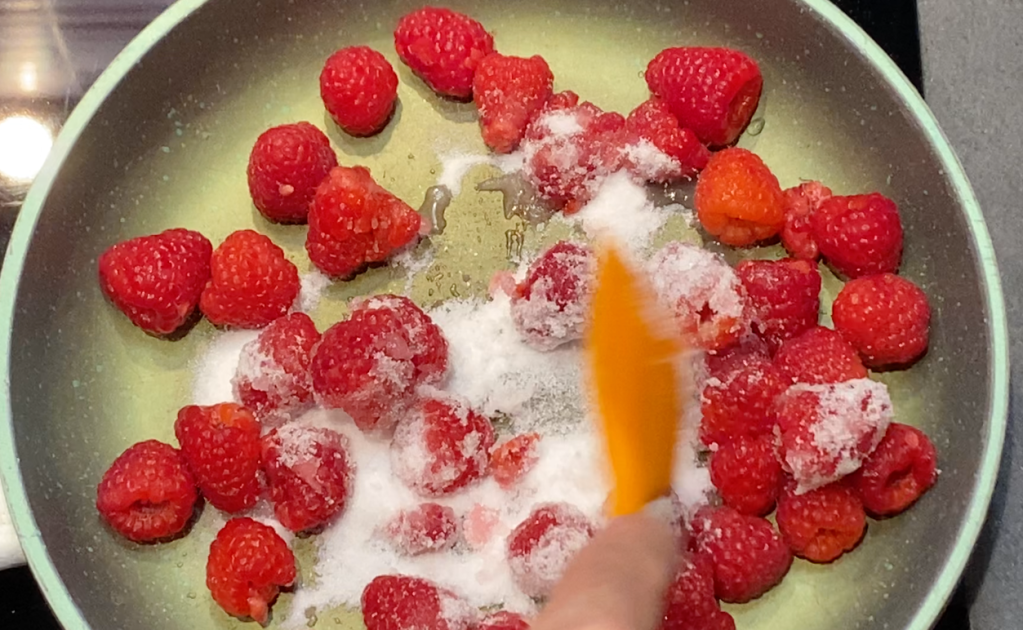 Il primo passaggio è far sciogliere i lamponi con il calore.