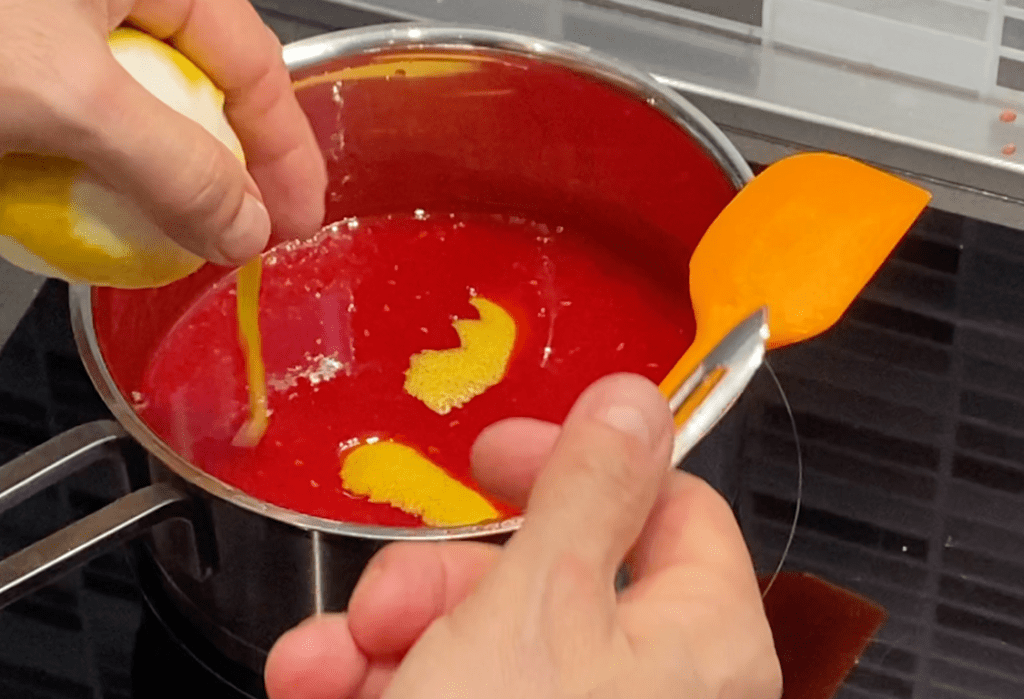 Aggiungere un po’ di scorza di limone Bio in modo da permettere la gelificazione della purea.