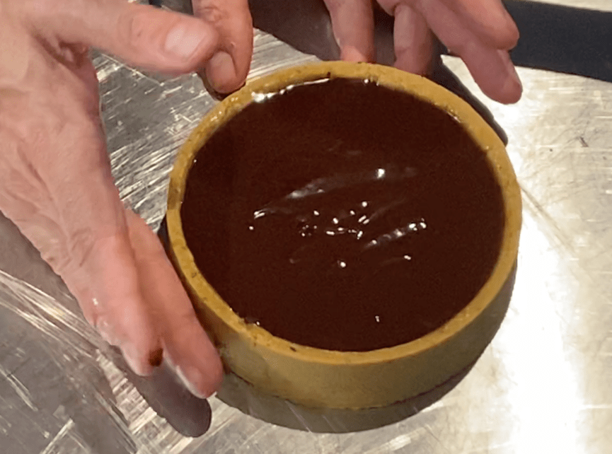 Muovere lo stampo con movimenti leggeri in modo da far distendere bene la superficie della ganache.