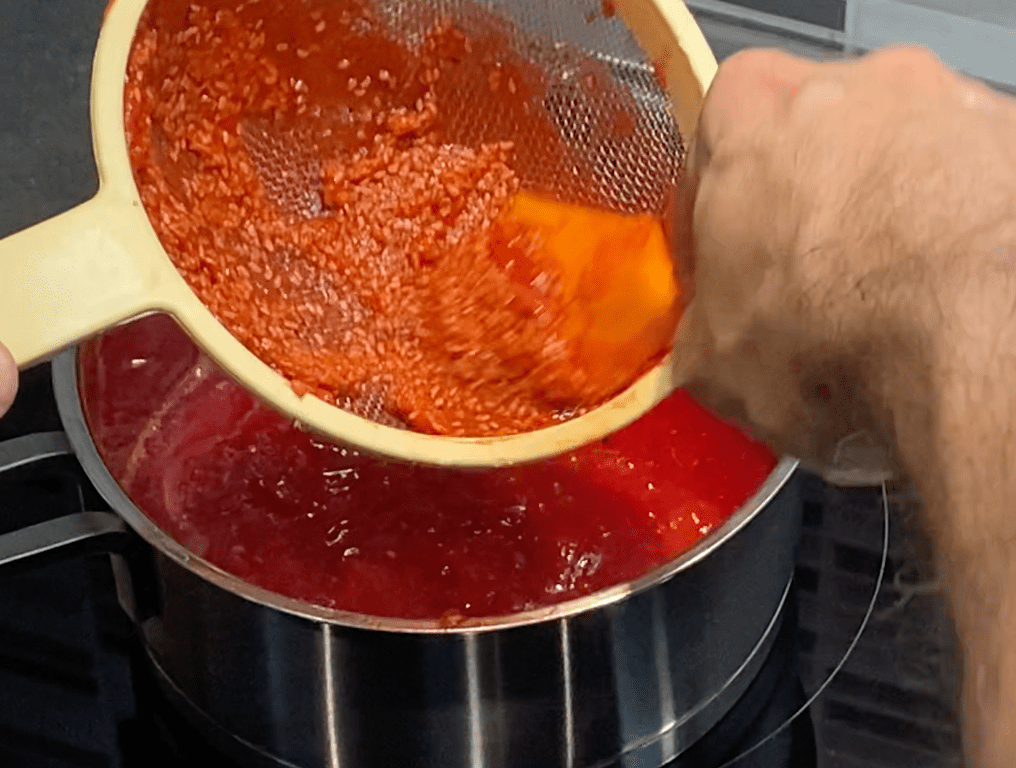 Una volta che i lamponi sono completamente sciolti, passare la salsa attraverso un colino per eliminare i semi.